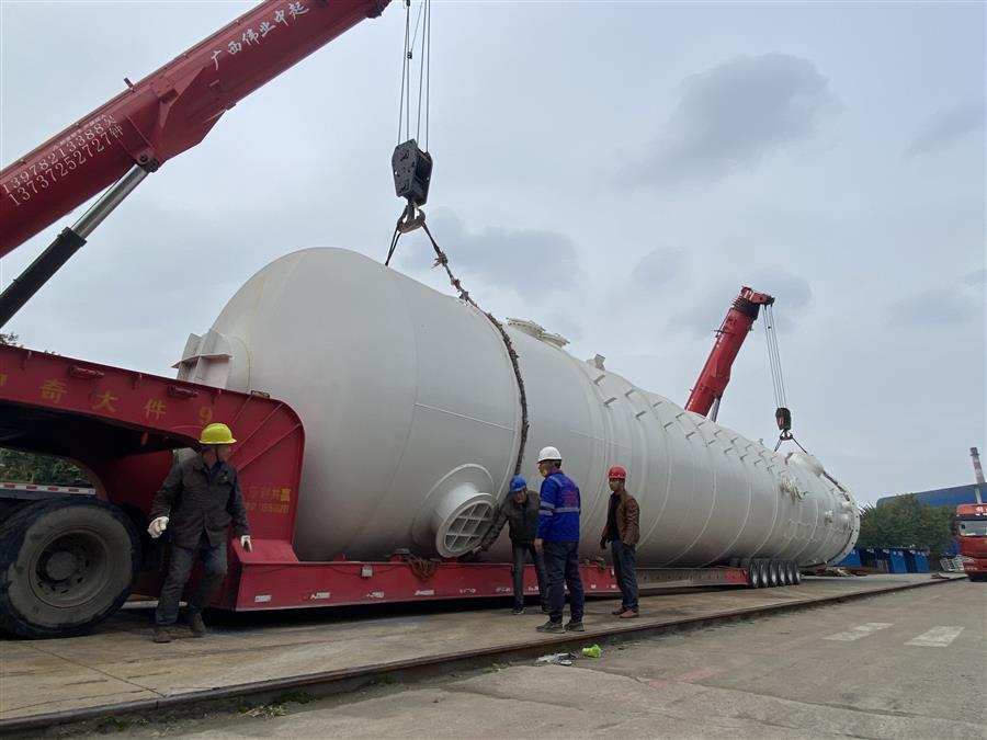 制造過程中,壓力容器制造廠在項目制造周期短、施工人力資源緊張的情況下,認真組織技術骨干進行施工,全力以赴順利按需完成了項目的交付任務。其中,空冷塔容積直徑4.2m,高(長)28.3m,重量約65噸;水冷塔直徑4.2m,長22.1m,重量約40噸。