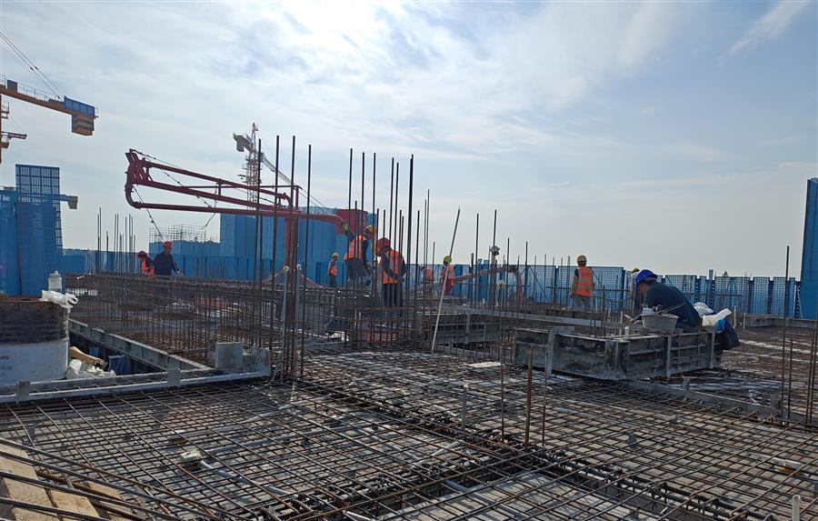 為確保工程快速推進,項目部實行兩班制,科學(xué)制定了夜間專項施工方案,倒排工期,規(guī)劃任務(wù)單,明確了各施工點的建設(shè)內(nèi)容、時間節(jié)點以及相關(guān)責(zé)任人,有序推進夜間施工作業(yè)。目前,中試車間一層二次結(jié)構(gòu)砌筑完成;1#、2#生產(chǎn)車間正在搭設(shè)49-57軸模架及進行40-45軸剛性地面施工;宿舍樓在進行4層梁板砼澆筑和頂板模板、鋼筋施工;倉庫在進行2層梁板砼澆筑和2層模架搭設(shè)。累計完成產(chǎn)值約1.15億元,完成合同造價的23.5%。