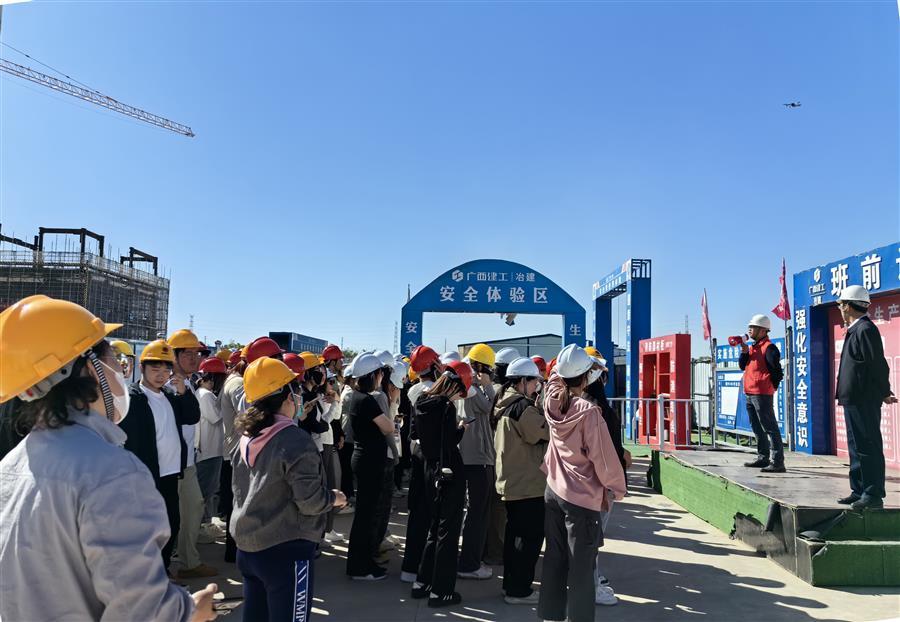在參觀前,項目負責人簡要介紹了冶建公司發(fā)展歷程和項目概況,詳細講解了施工現(xiàn)場的各項安全注意事項。之后,所有人員佩戴好安全帽有序進入施工現(xiàn)場進行參觀。觀摩學習過程中,項目管理人員對項目正在進行的二次結(jié)構(gòu)砌筑、型鋼混凝土結(jié)構(gòu)、盤扣架以及鋼筋綁扎等工序進行了生動形象地講解,并就工程的重點、難點問題和解決方法開展了現(xiàn)場答疑交流,將在建項目施工現(xiàn)場變?yōu)閷嵺`課堂,幫助學生們更好地把理論知識與實踐相結(jié)合,推動參觀學習走深走實。