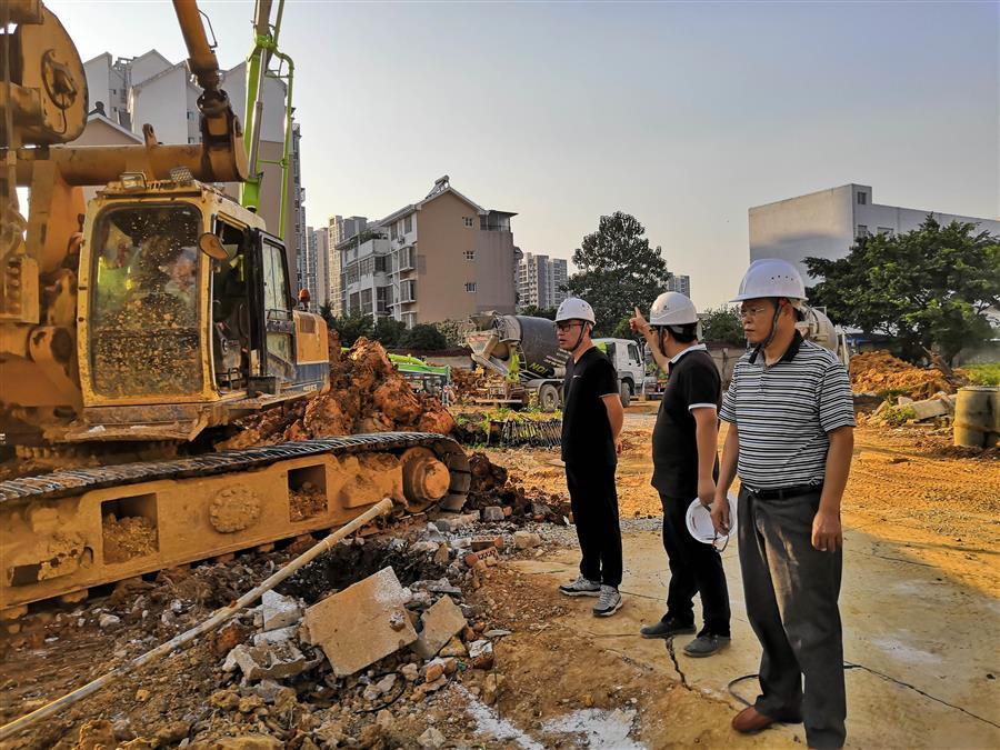 10月5日上午,桂東分公司經(jīng)理謝勇、黨支部書記黃桂軍來到柳州市防汛抗旱物資儲備倉庫工程項(xiàng)目現(xiàn)場慰問看望節(jié)假日仍堅(jiān)守崗位的一線員工。該項(xiàng)目施工現(xiàn)場地質(zhì)條件復(fù)雜,容易塌孔且地下層部分為巖石層結(jié)構(gòu),施工難度大。為確保在甲方要求的工期內(nèi)完成施工,工人們節(jié)假日仍加班加點(diǎn)搶工期。他們腳踏黃土,頭頂著炎炎烈日,揮灑著蒸騰的汗水,以實(shí)際行動為集團(tuán)公司早日躋身世界500強(qiáng)貢獻(xiàn)力量!