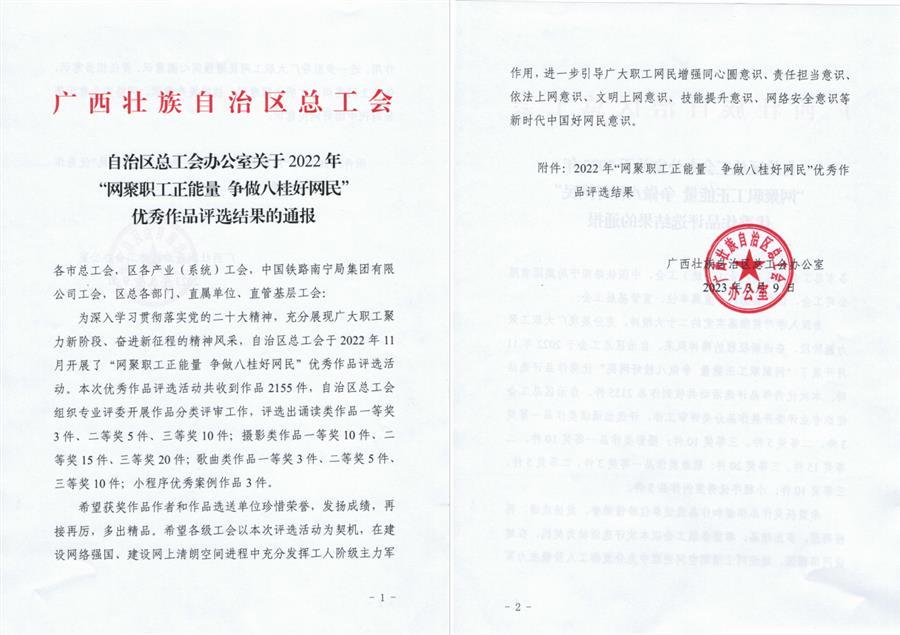 近日,自治區(qū)總工會(huì)公布了2022年“網(wǎng)聚職工正能 爭(zhēng)做八桂好網(wǎng)民”優(yōu)秀作品評(píng)選結(jié)果,公司職工攝影作品《焊花飛濺鑄匠心》榮獲一等獎(jiǎng),《組圖:爬“天梯”去植綠》榮獲三等獎(jiǎng)。