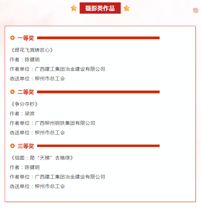 據(jù)了解,自活動(dòng)啟動(dòng)以來(lái),全市各級(jí)工會(huì)和廣大職工朋友積極響應(yīng),共報(bào)送各類(lèi)作品124件,柳州市共有14件優(yōu)秀作品獲獎(jiǎng),其中公司有2件作品獲獎(jiǎng),分別是《焊花飛濺鑄匠心》和《組圖:爬“天梯”去植綠》。